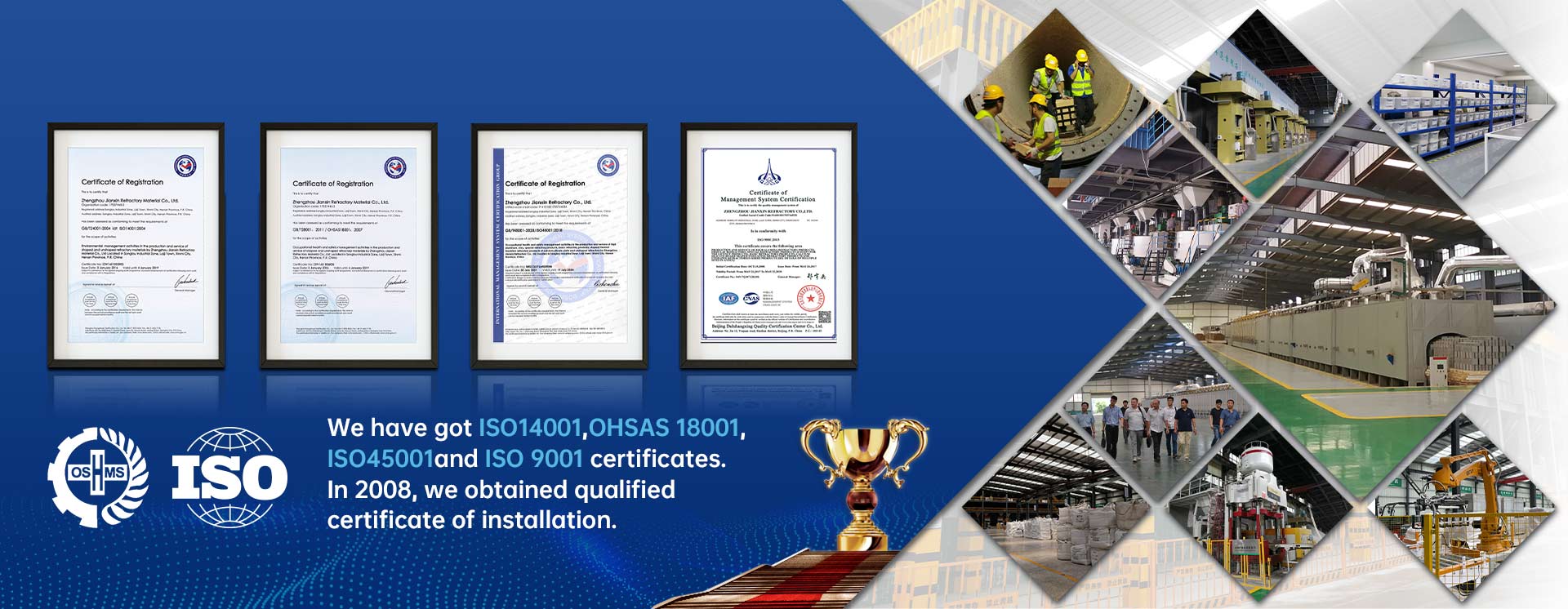 公司致力于耐火新材料、新技術、新產品的開發和推廣應用,是國家高新技術企業,產品先后通過了ISO9001質量管理體系、ISO14001環境管理體系、GB/T28001職業健康安全管理體系認證,同時具有防水防腐保溫工程專業承包貳級資質、冶金工程施工總承包叁級資質、環保工程專業承包叁級資質。